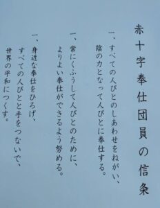 赤十字奉仕団員の信条の中の1文に「すべてのひとびとのしあわせをねがい、陰の力となって人々に奉仕する」。この1文を読みあらためて自分の活動に照らし合わせ気づかされた感じがしました。